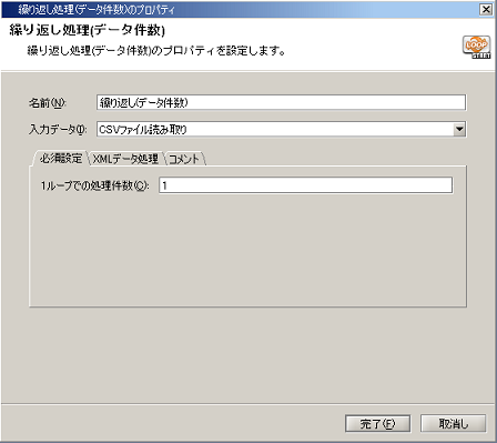 繰り返し(データ件数)処理のプロパティ設定は以下のとおりです。