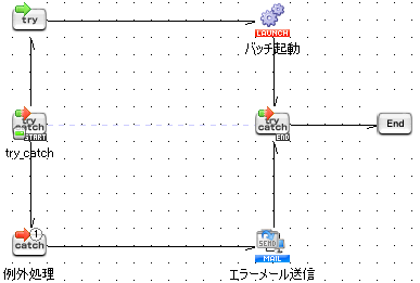 対象となる処理で例外が発生した場合の例外処理で使用するコンポーネントを[例外処理]から[例外監視終了]の間に配置します。