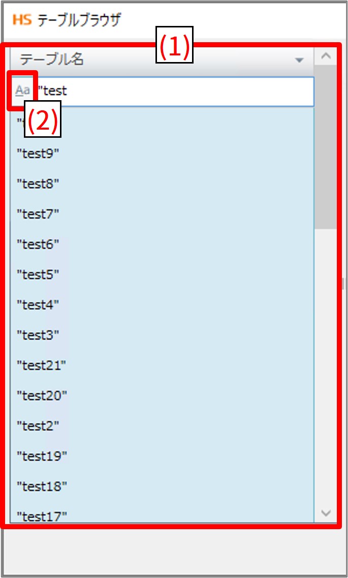 入力した文字列を含むテーブル名の一覧をフィルタリングして表示します。 |