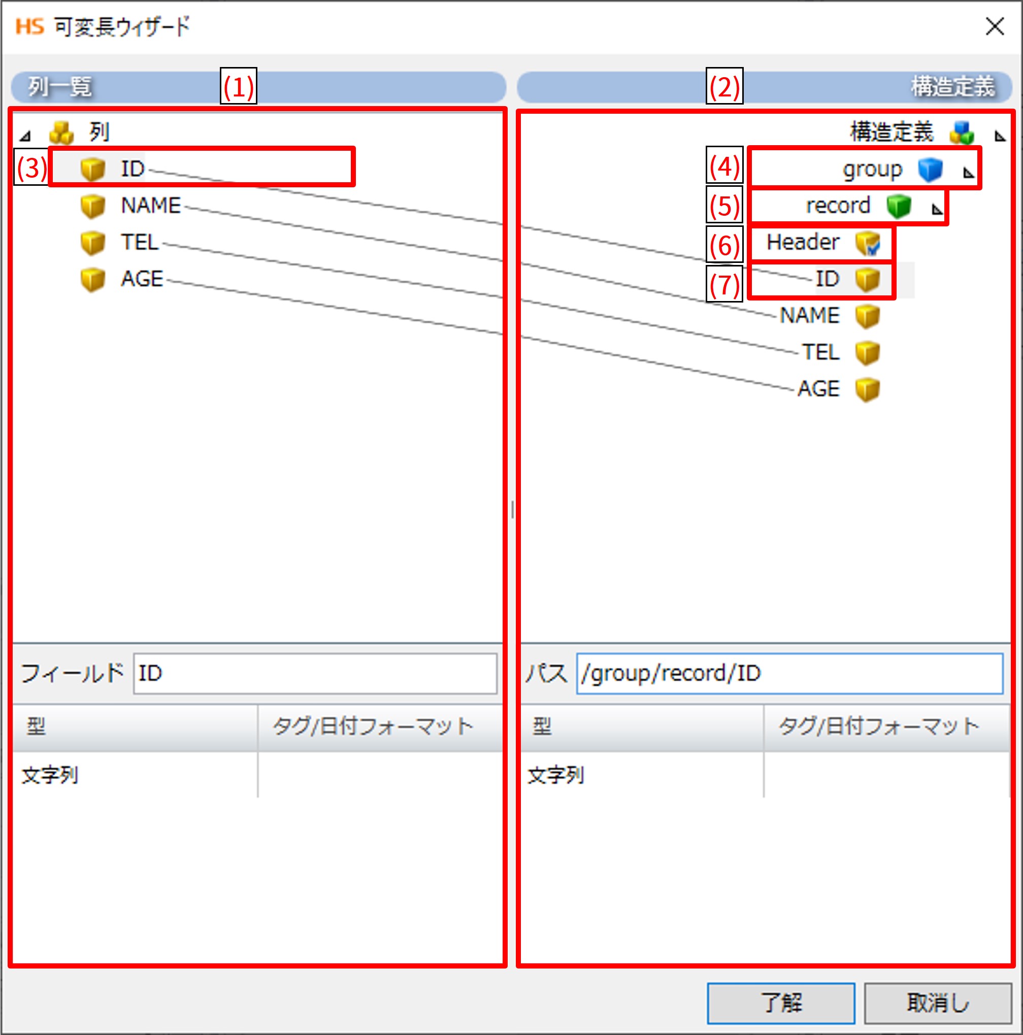 列一覧では、入力データのカラムをフィールドとして構造情報を定義し、可変長データの1レコードを定義します。