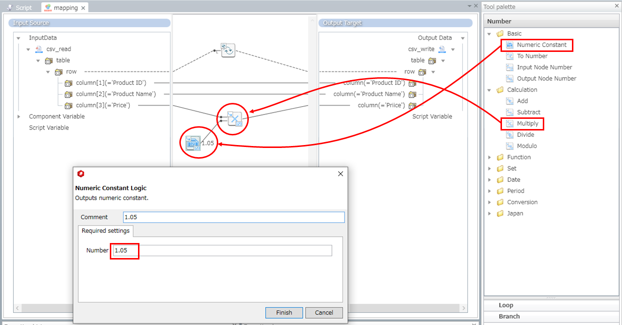 たとえば、入力データに数値「1.05」を乗算し、出力するという処理の場合、以下のように設定します。