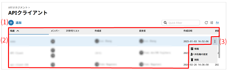 ナビゲーションメニューで > APIマネジメント > APIクライアントを選択すると、このページが表示されます。