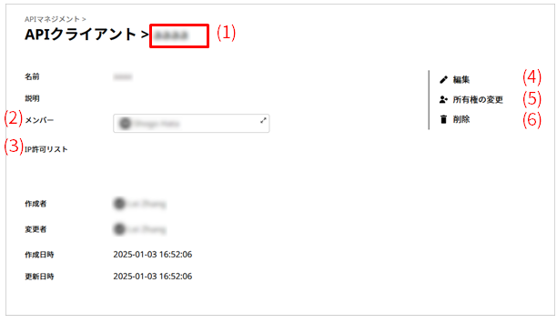 選択中のAPIクライアントに関する詳細情報が表示されます。APIクライアントの詳細情報の編集および削除もできます。