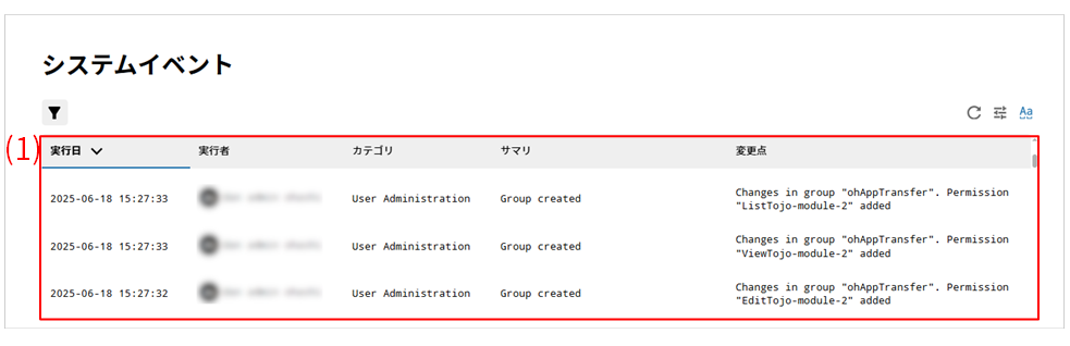 システムイベントページでは、ユーザーによる設定の変更がログとして表示されます。
