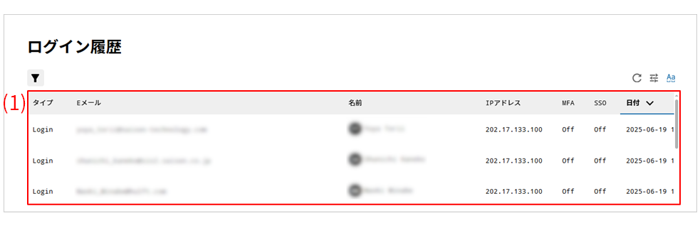 ログイン履歴ページを表示するには、ナビゲーションメニューの > ログ > ログイン履歴を選択します。
