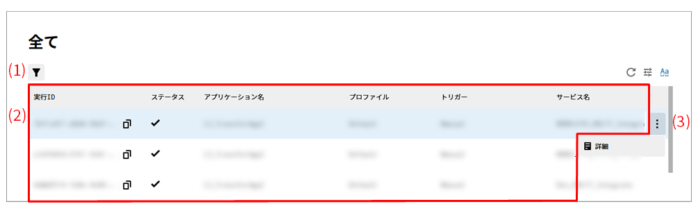 モニタリングカテゴリーの全てページでは、アプリケーションの実行ステータスをイベントログとして確認できます。