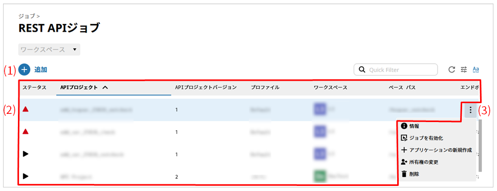 設定済のREST APIジョブの情報が表形式で表示されます。