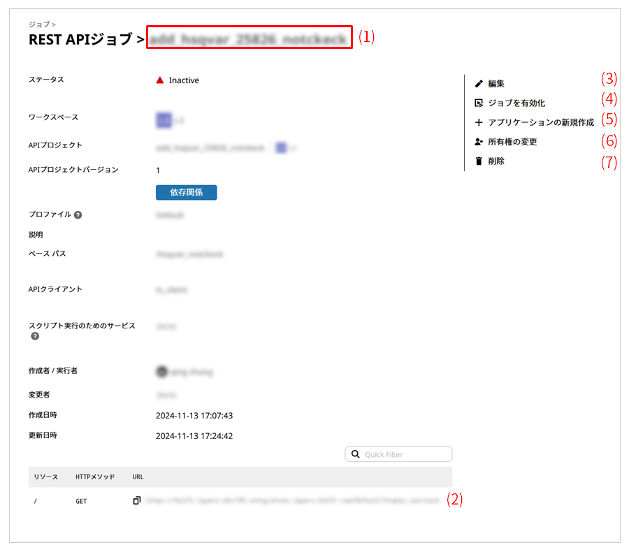 REST APIジョブを編集し更新すると、APIのエンドポイントは再発行されます。REST APIジョブを更新した場合は、APIの呼び出し元のエンドポイントを再発行された内容に変更する必要があります。