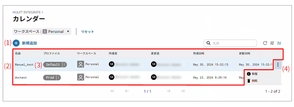 カレンダーを登録しているプロファイルが一覧で表示されます。
