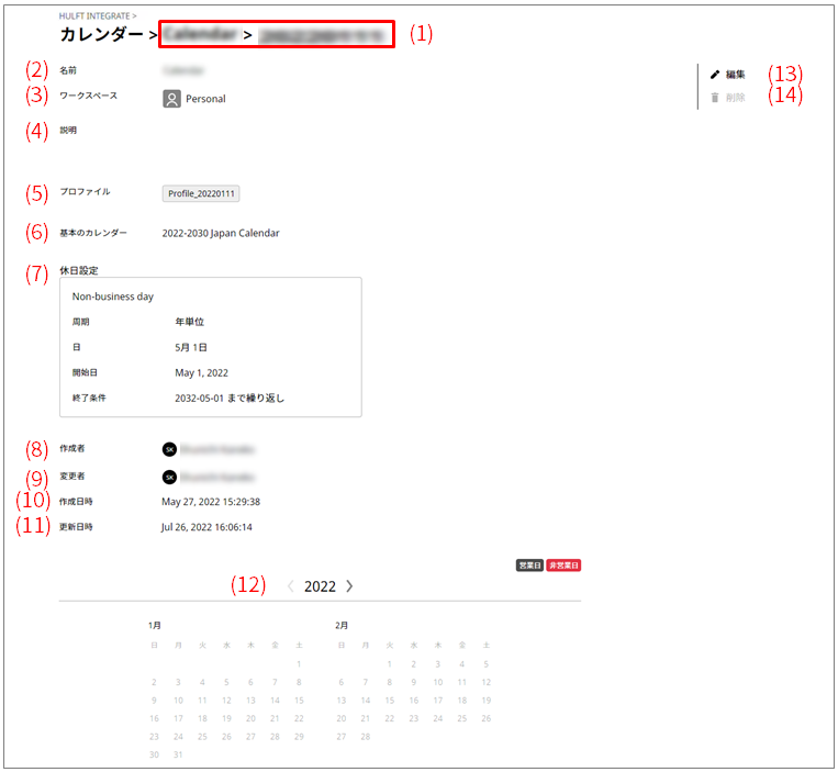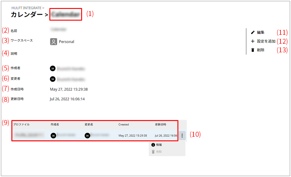 カレンダー > カレンダー名ページで、プロファイルリストのアクションメニューから情報を選択すると、このページが表示されます。