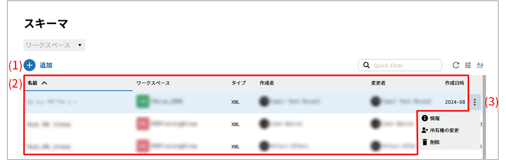 スキーマページでは、スキーマの作成、削除、および詳細情報の表示を行うことで、ドキュメントMapperで使用するスキーマを管理できます。
