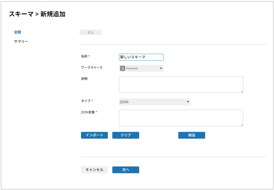 スキーマを新規作成するには、スキーマページの追加を選択し、JSONスキーマまたはXMLスキーマを入力します。
