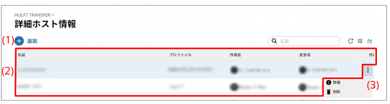 作成済のHULFT Transfer詳細ホスト情報が表形式で表示されます。