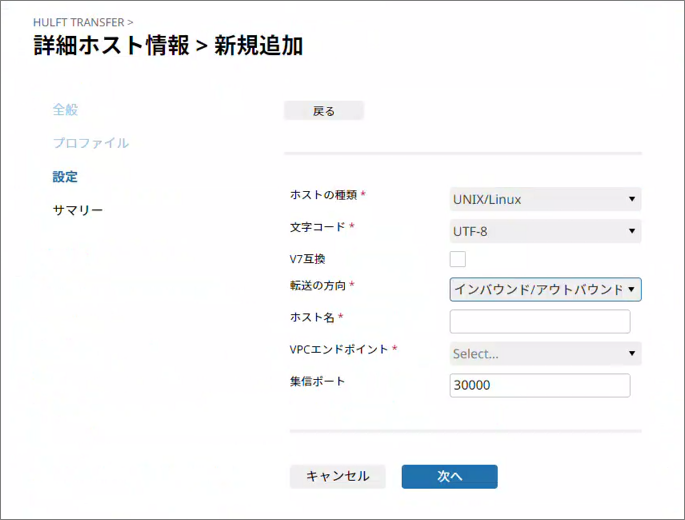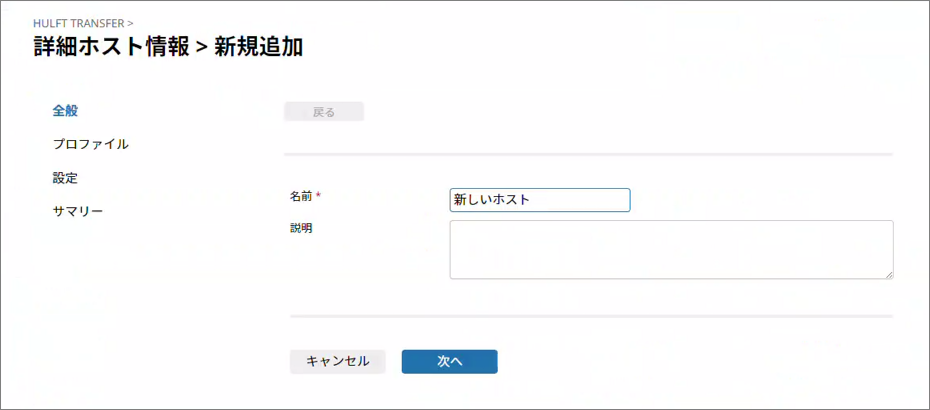 ウィザード形式のページで、作成するHULFT Transfer詳細ホスト情報を順番に設定できます。