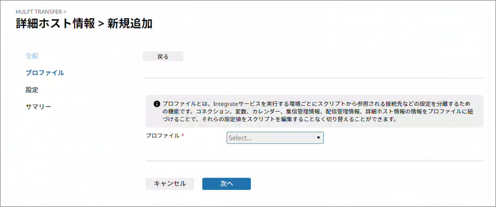 HULFT Transfer詳細ホスト情報と紐づけるプロファイルを選択します。