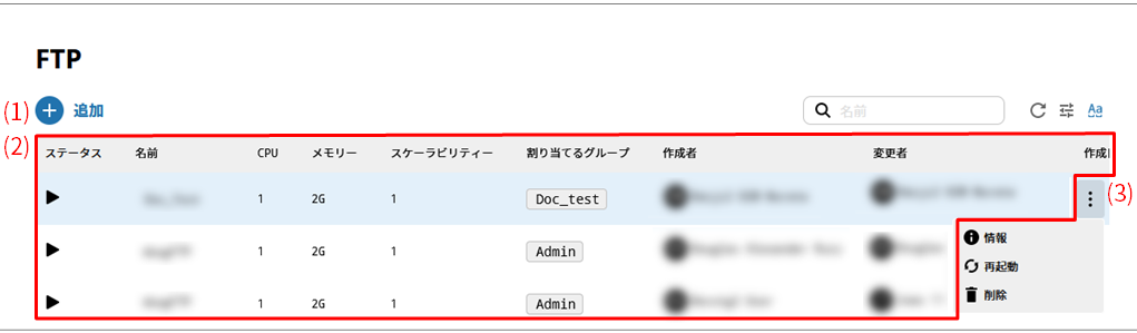 FTP サービスの管理はここで行います。サービスの作成、詳細情報の表示、再起動、および削除などの操作を実行できます。