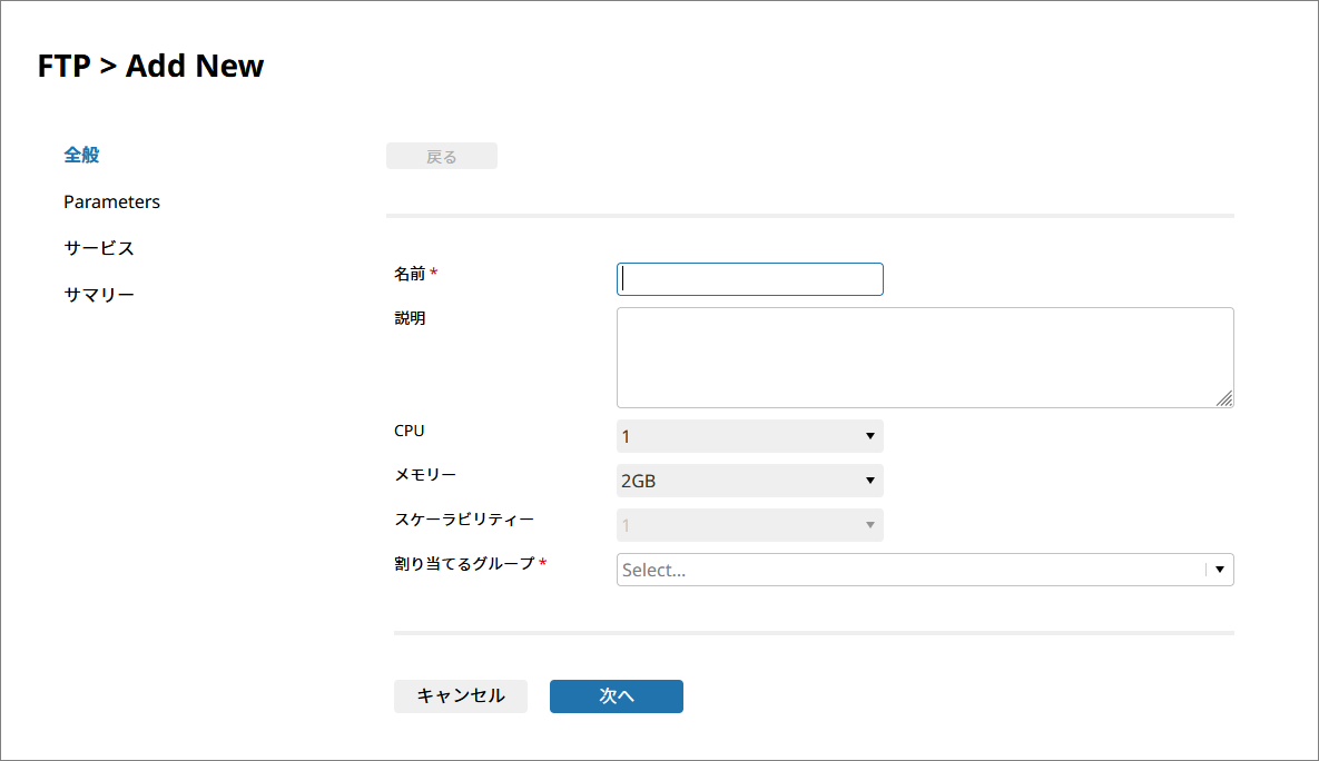 実行が必要なグループに権限付与を行います。FTP サービスを作成する際には、取り扱うデータに応じて、CPUリソースの割り当て、メモリーサイズを決定します。