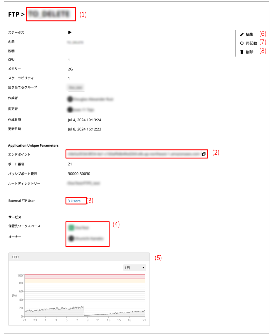 選択中のサービスに関する詳細情報が表示されます。表示されているFTP サービスを編集、再起動、および削除することができます。