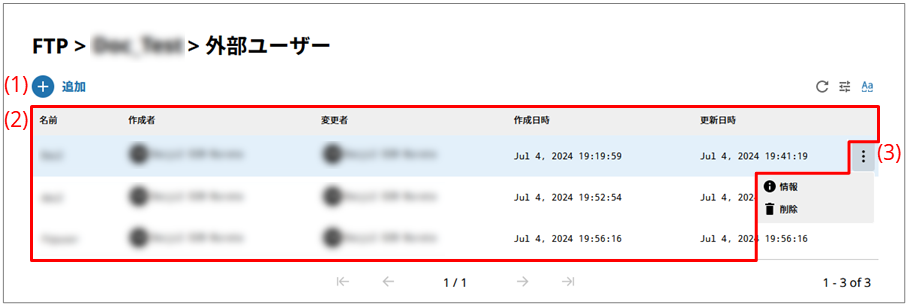 作成済の外部ユーザーの情報が表形式で表示されます。