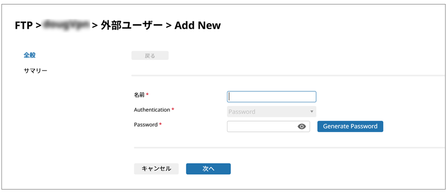 選択すると、「FTP > FTP サービス名 > 外部ユーザー > Add New」が表示されます。