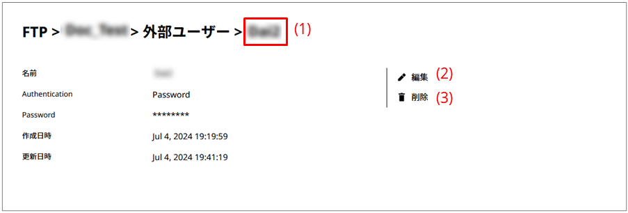 選択すると、「FTP > FTP サービス名 > 外部ユーザー > 外部ユーザー名」が表示されます。