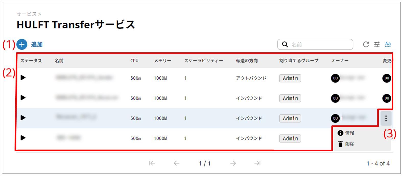 設定済のHULFT Transferサービスの情報が表形式で表示されます。