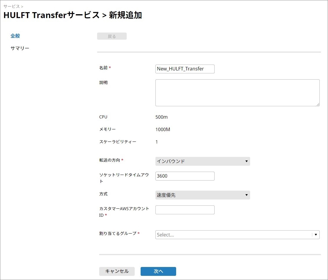 HULFT Transferサービスの設定については、「HULFT Transfer > 新規追加」の説明を参照してください。
