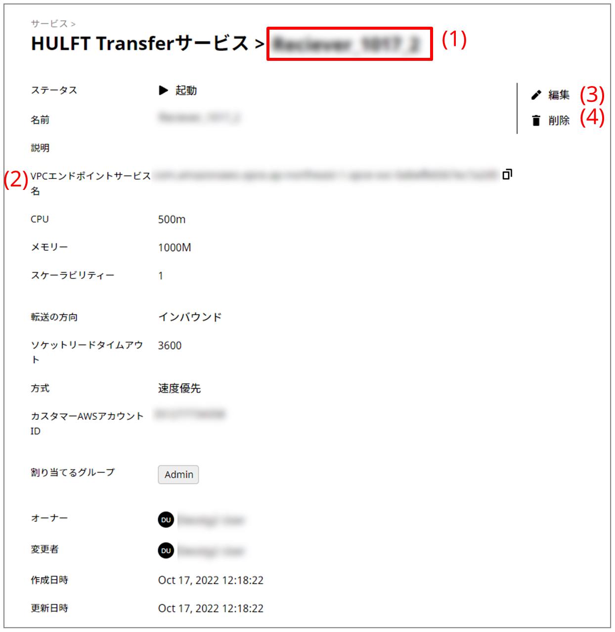 選択中のHULFT Transferサービスの詳細情報が表示されます。HULFT Transferサービスの詳細情報の編集および削除もできます。