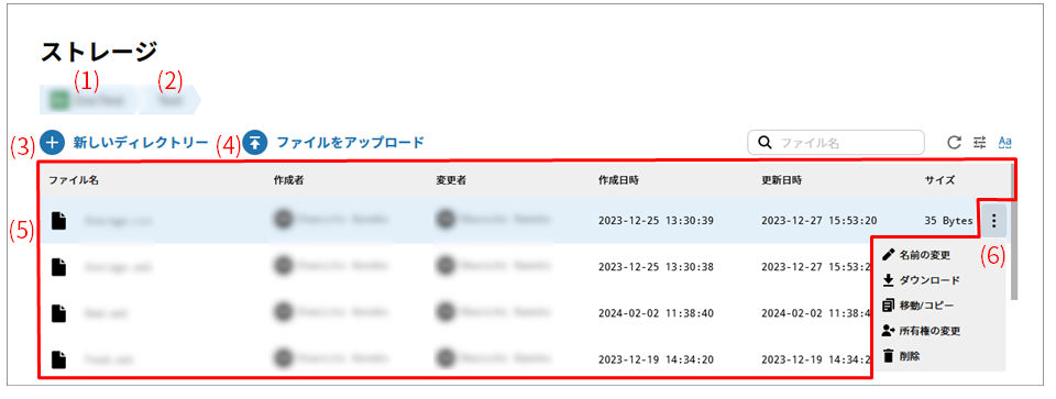 ストレージページでは、新しいディレクトリーまたはファイルをアップロードを使用してストレージにファイルまたはディレクトリーを追加できます。選択したファイルへのアクセス権がある場合、ダウンロードなどの機能を実行できます。