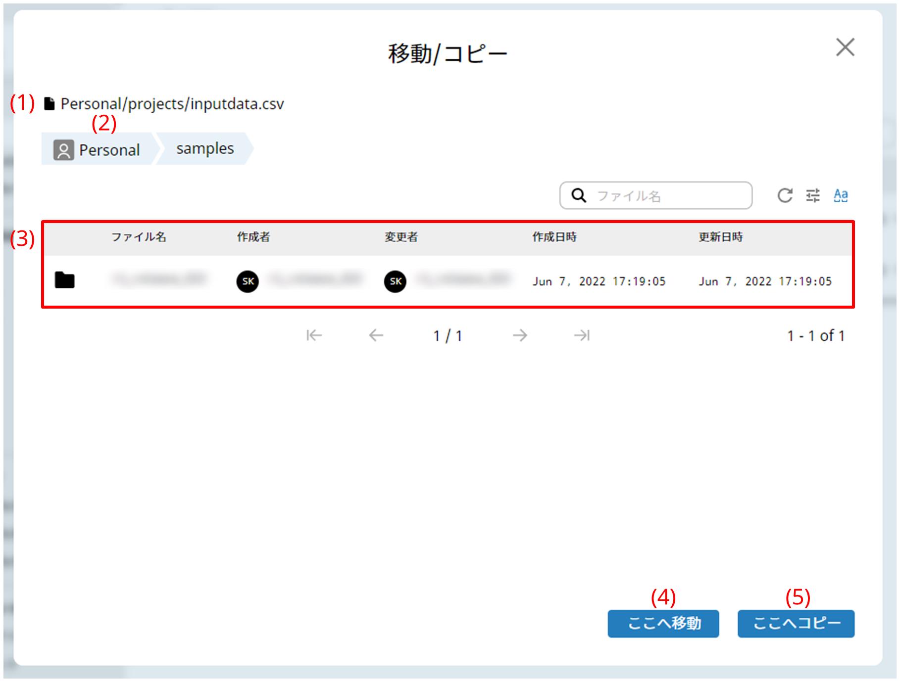 ストレージページで、ディレクトリー/ファイルリストのアクションメニューから移動/コピーを選択すると、このダイアログボックスが表示されます。