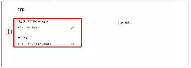 FTPページでは、ジョブ-アプリケーションの実行が失敗した時やFTPサービスの停止または起動した時に通知するかどうかを設定できます。通知するを設定した場合、ステータスが変更された時にブラウザーに通知されます。
