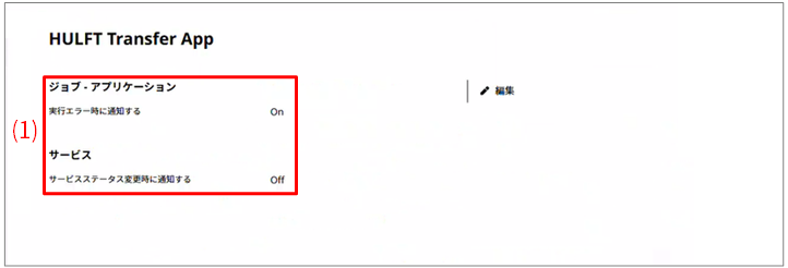 HULFT Transfer Appページでは、ジョブ-アプリケーションの実行が失敗した時やHULFT Transfer Appサービスの停止または起動した時に通知するかどうかを設定できます。通知するを設定した場合、ステータスが変更された時にブラウザーに通知されます。