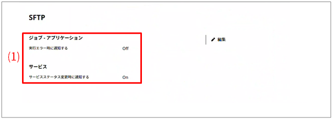 SFTPページでは、ジョブ-アプリケーションの実行が失敗した時やSFTPサービスの停止または起動した時に通知するかどうかを設定できます。通知するを設定した場合、ステータスが変更された時にブラウザーに通知されます。