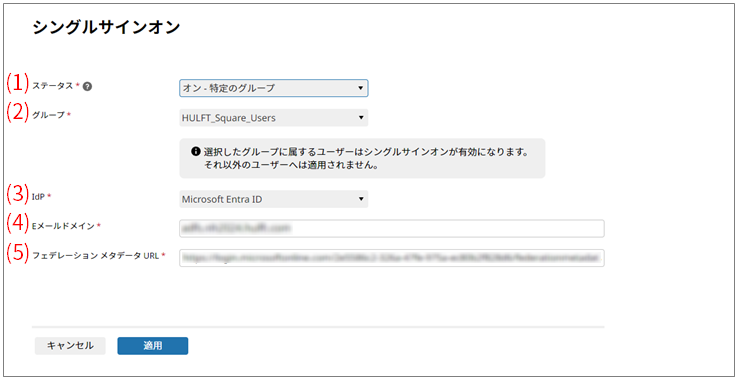 お客様環境で設定されたADFSまたはMicrosoft Entra IDをHULFT Squareに登録するために、フェデレーションメタデータのURLを指定します。