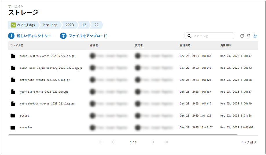保管先ワークスペースで指定したワークスペースのストレージにhsq-logsディレクトリーおよびapp-logsディレクトリーが作成され、そのディレクトリーにgz形式またはCSV形式でログが保管されます。gz形式のファイルの内容を確認するには、圧縮ファイルの展開ツールが別途必要です。