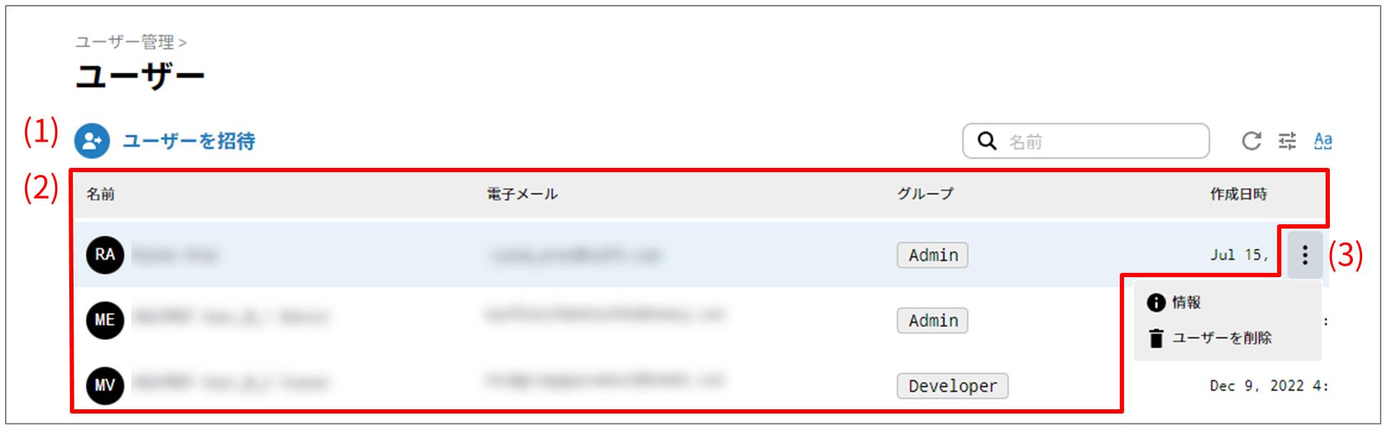 ユーザーページでは、管理者がユーザーの招待や削除などを行って、ユーザーを管理することができます。
