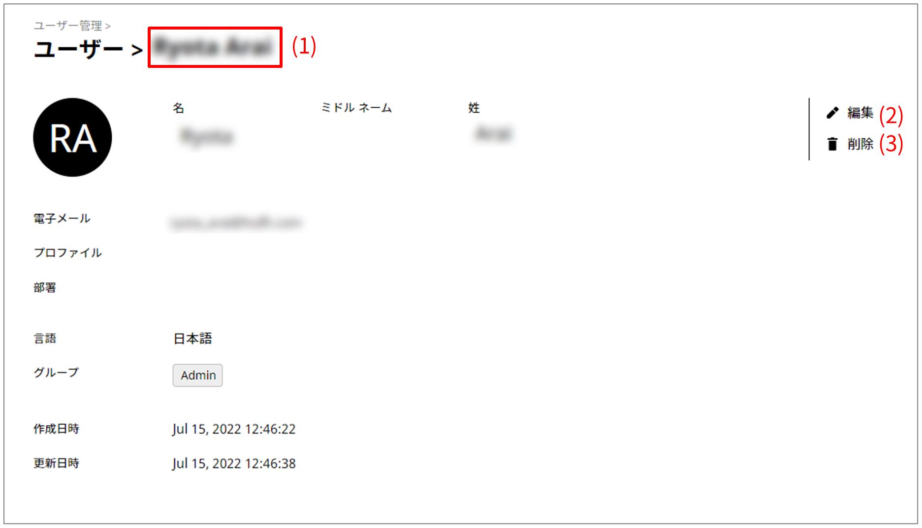 選択中のユーザーの詳細情報の表示、登録情報の変更、ユーザーの削除を実行できます。
