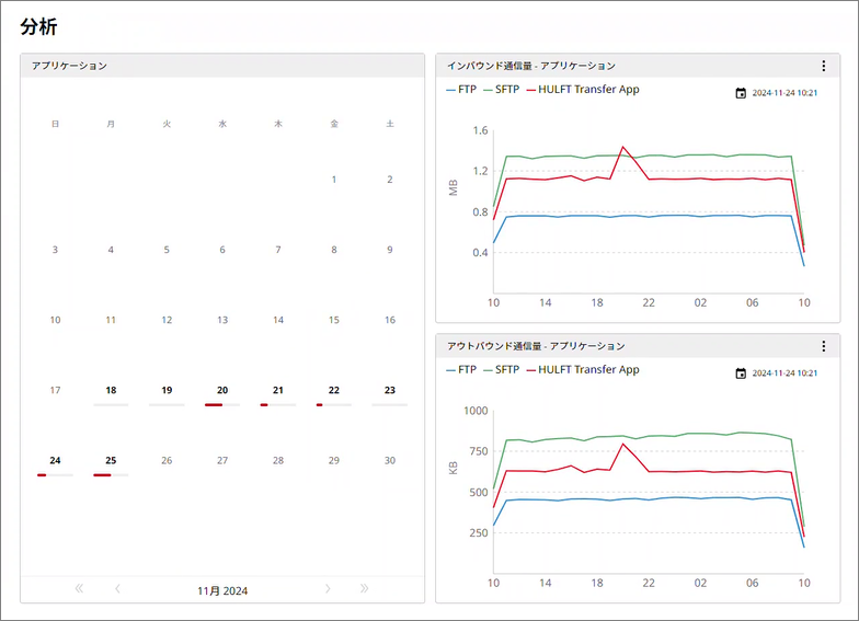 アプリケーションごとにインバウンドおよびアウトバウンドの通信量を時系列で、ナビゲーションメニューの > 分析から確認できます。