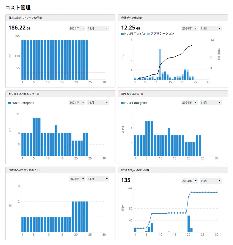 HULFT Squareで使われている各種データや利用状況を、ナビゲーションメニューの > コスト管理から確認できます。