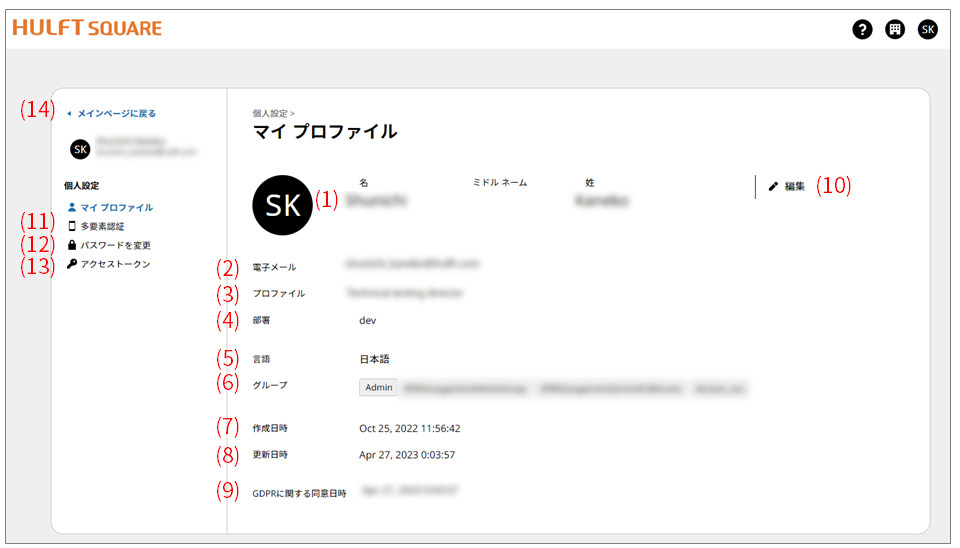 HULFT Squareサイト右上にある個人設定アイコンから個人設定を選択すると、マイプロファイルページが表示されます。