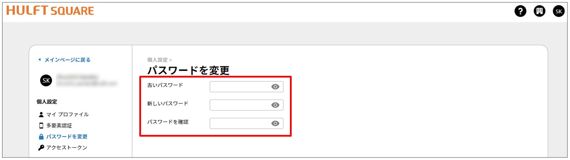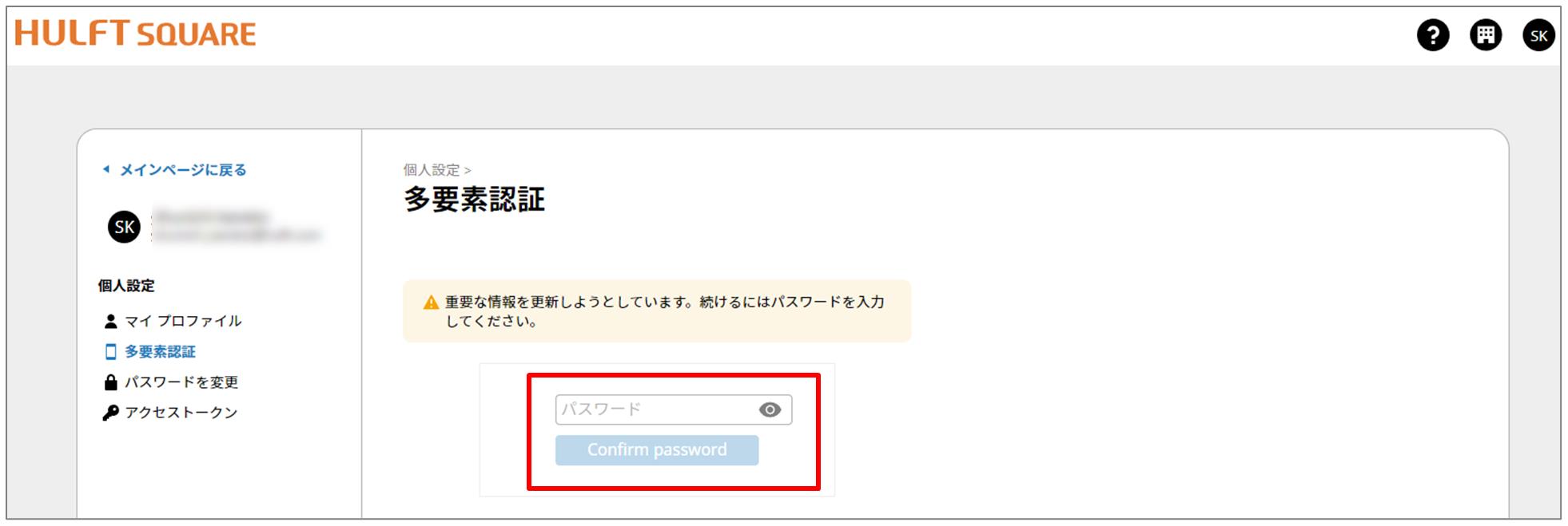 パスワードの変更後、新しいパスワードでHULFT Squareサイトにログインし、必要に応じて多要素認証を再設定してください。