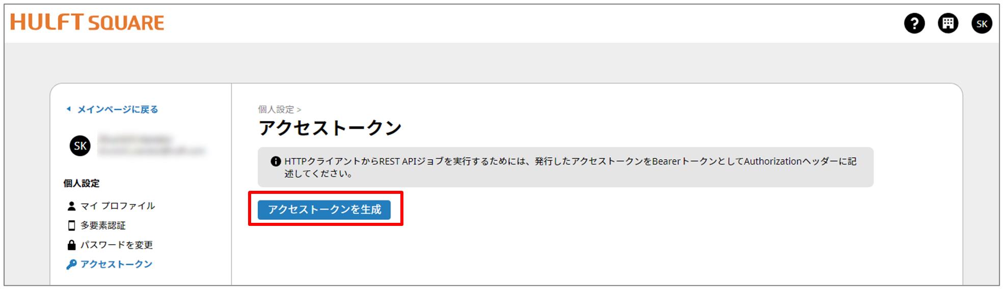 個人設定ページでアクセストークンを選択すると、アクセストークンページが表示されます。