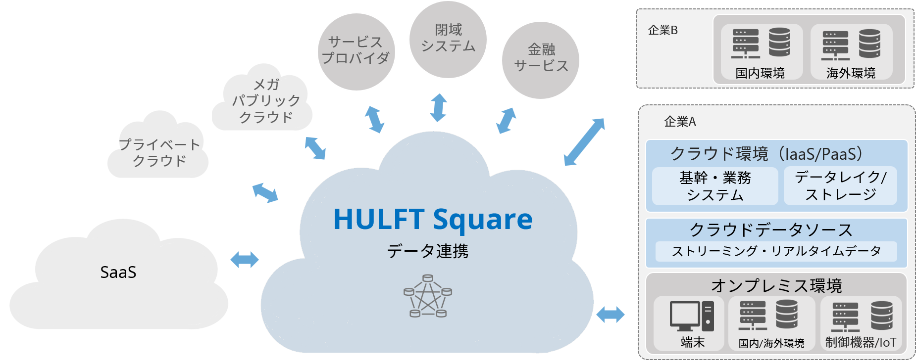 HULFT Squareは、オンプレミス環境およびクラウド環境に存在する既存のコアシステムだけでなく、多種多様なシステムおよびサービスと統合することができます。