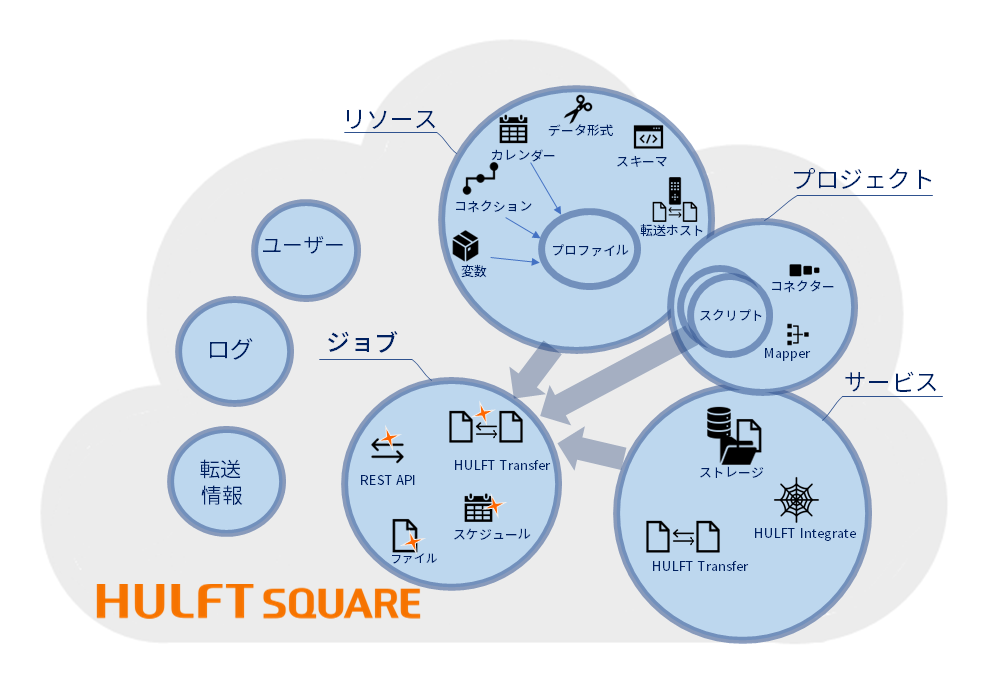 HULFT Squareでは、HULFT Squareと対象のシステムおよびサービスとのデータ連携を定義するために、さまざまな要素が使用されます。