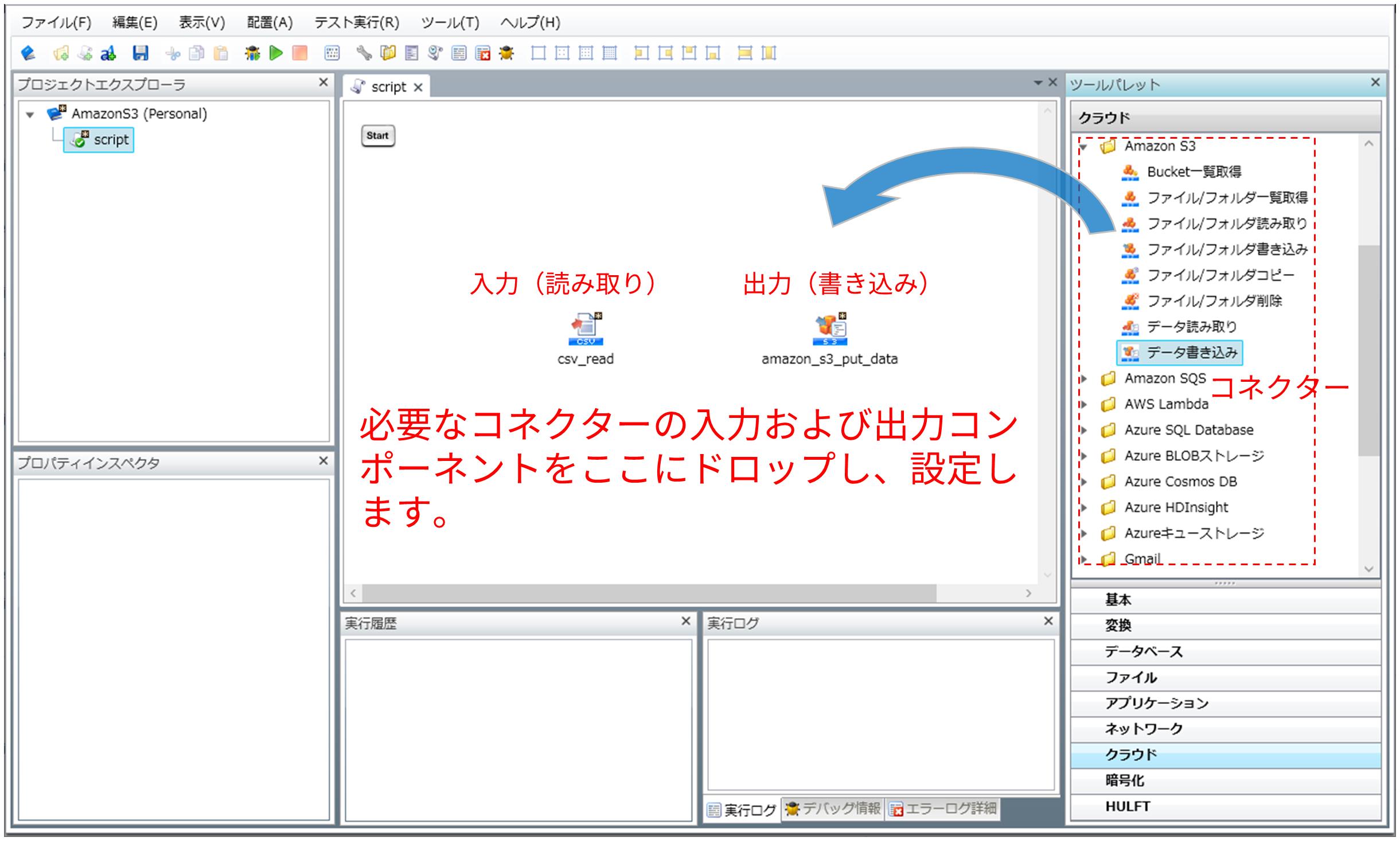データ連携フローを定義するには、プロジェクトとスクリプトを作成し、デザイナーのスクリプトキャンバスで必要なコネクターの入力および出力コンポーネントを配置します。次に、入力および出力データの仕様に従ってコンポーネントを設定します。コードを記述する必要はありません。