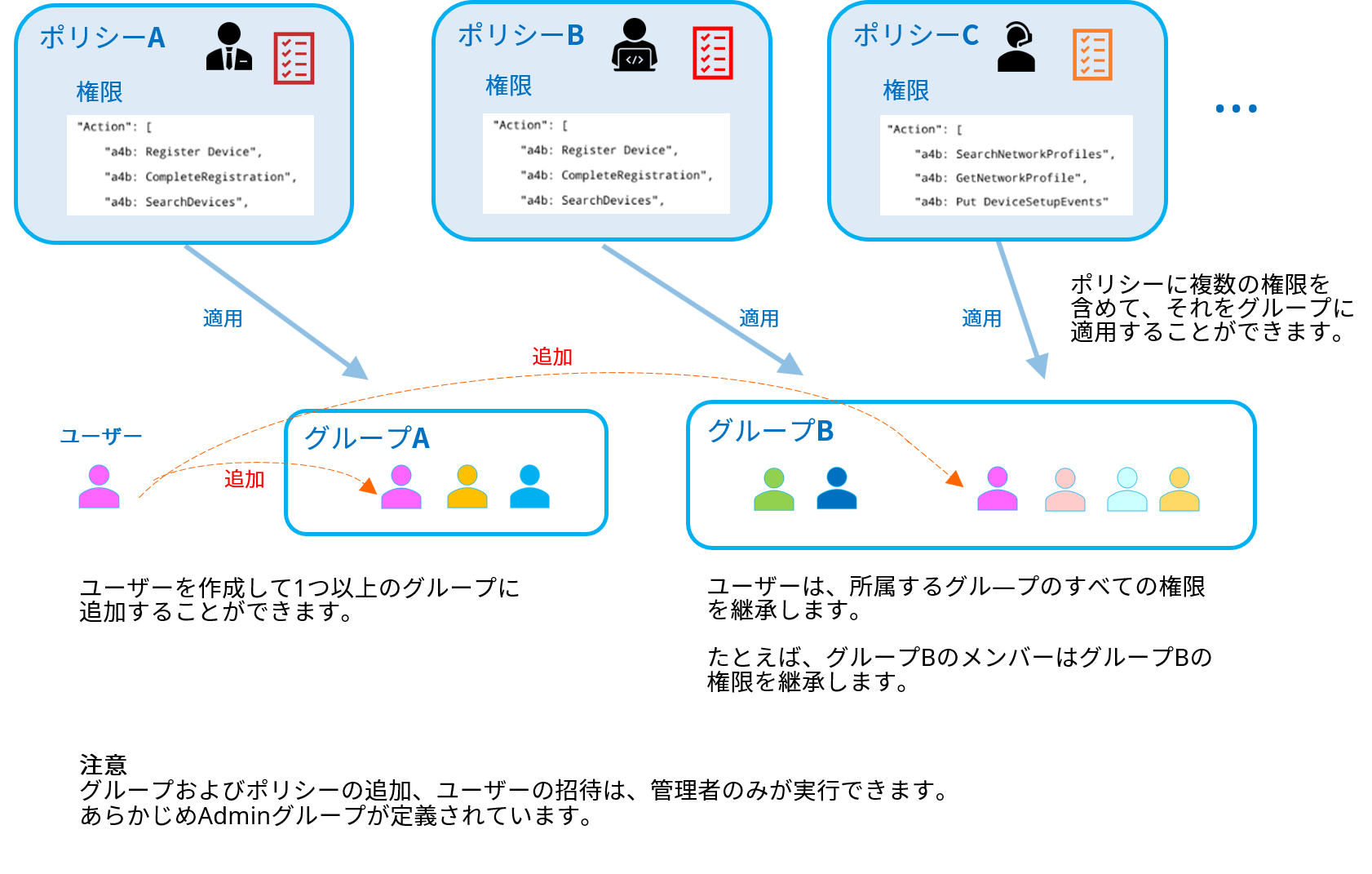 ポリシーを使用すると、グループ内の複数のユーザーに、同じ権限セットを割り当てることができます。管理者は、グループに対して1つ以上のポリシーを割り当てることができます。