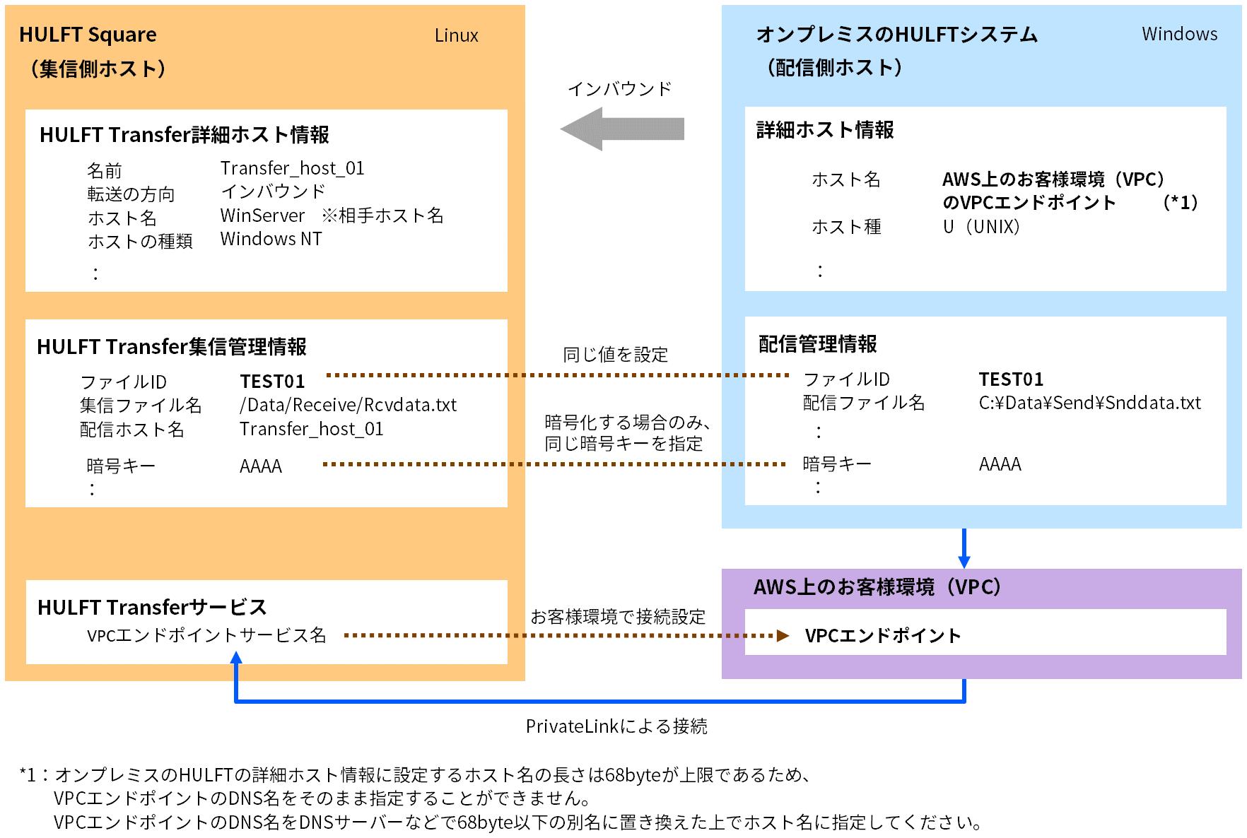 お客様環境(VPC)でVPCエンドポイントを作成し、HULFTSquare(VPC)で作成したVPCエンドポイントサービスとPrivateLinkで接続する設定を行ってください。
