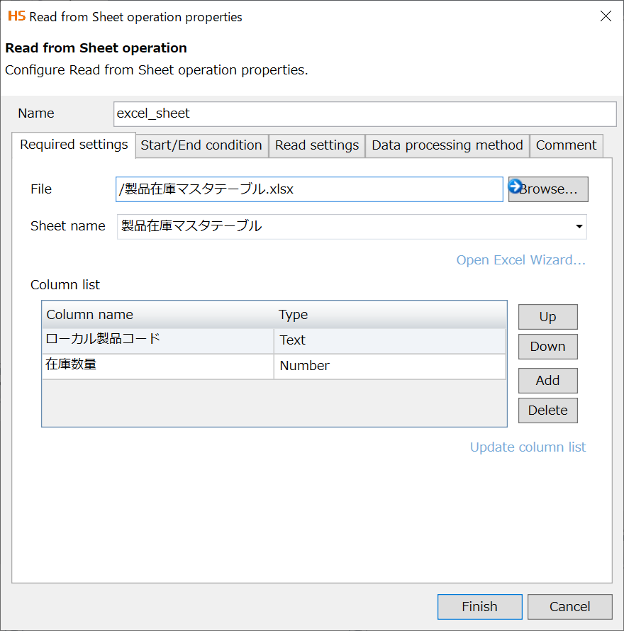 デザイナーのツールパレットファイル > Excel > シートから読み取りをスクリプトキャンバスにドラッグ&ドロップします。