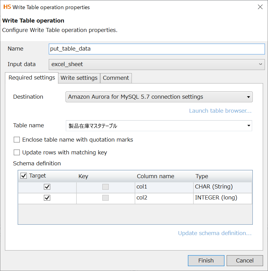 デザイナーのツールパレットからクラウド > Amazon Aurora for MySQL > テーブル書き込みをスクリプトキャンバスにドラッグ&ドロップします。
