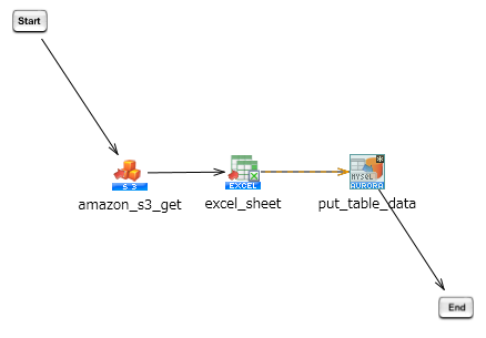 Amazon S3からAmazon Aurora for MySQL 5.7のデータベースにデータを書き込む場合、ファイル/フォルダ読み取り処理およびシートから読み取り処理でデータを読み取り、テーブル書き込み処理でデータベースに書き込みます。